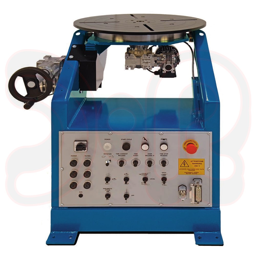 Stabile Drehtisch-Positioniervorrichtung mit manueller Kippung und einer Tragkraft von 750 kg. Rotation mit Wechselstrom-Elektromotor mit Inverter über Endlosschneckenuntersetzung und Kugelscheibe. Das Gerät verfügt über eine Mehrfunktionssteuerung mit Nahtüberlappung und automatischer Rückkehr zum Nullpunkt. Weiterhin ist es ausgestattet mit einem Fußpedal mit Start-Stop-Funktion, Hochfrequenzabschirmung und einer programmierbaren Steuerung (PLC) mit Regelung für Startverzögerung und einer Kraterfüllvorrichtung.