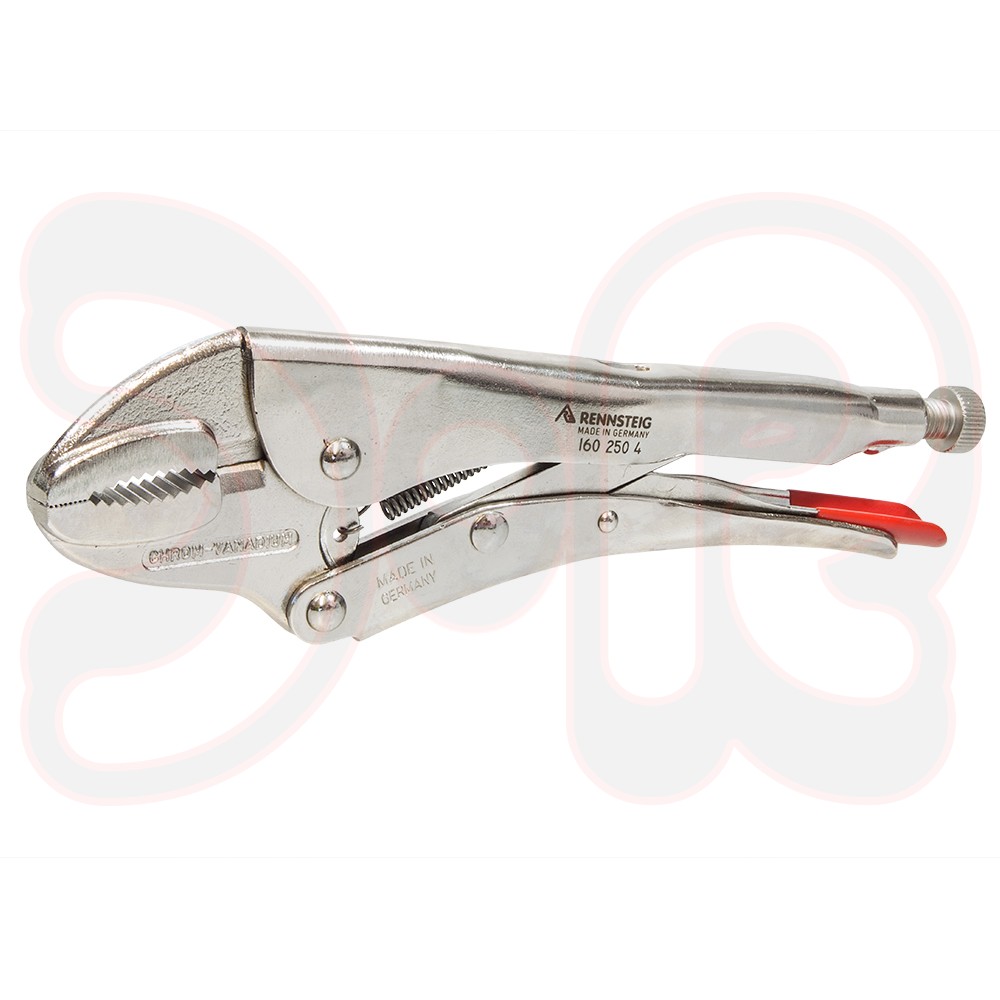 Zangenkörper aus Stahlblech, verstellbarer Spannbereich, Spannen über kniehebel und Lösen mittels Schnell-Lösehebel, Oberfläche vernickelt.